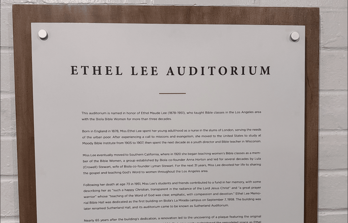 “We dedicate this auditorium to the glory of our Lord Jesus Christ in loving memory of Ethel Maude Lee (1878–1951), Biola Bible Woman, 1920–1951.”